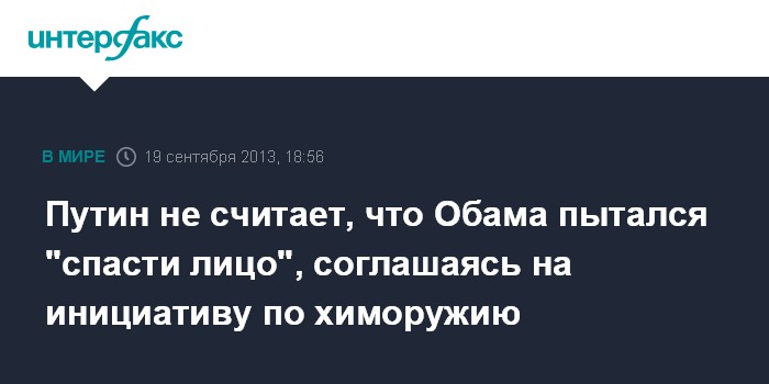 "Я не думаю, что эта инициатива о постановке сирийского химоружия под контроль способствовала, как вы сказали, тому, чтобы президент Обама спас свое лицо", - сказал Путин, отвечая на заседании дискуссионного клуба "Валдай" американскому политологу.