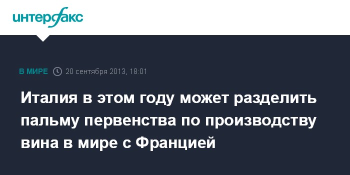 В прошлом году Италия заняла второе место по объемам производства вина в мире после Франции. Однако в этом году страны могут разделить первенство, поскольку министерство сельского хозяйства Франции ожидает повышения производства на 7,5%, также до 44,5 млн гектолитров, сообщает агентство Bloomberg.