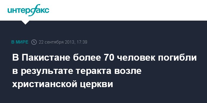 Исламабад. 22 сентября. INTERFAX.RU - Число жертв двух взрывов, устроенных близ христианского храма в пакистанском городе Пешавар, достигло 72 человек, сообщили в воскресенье региональные власти. Еще более 100 человек пострадали. По словам медиков, большая часть из них находится в критическом состоянии.
