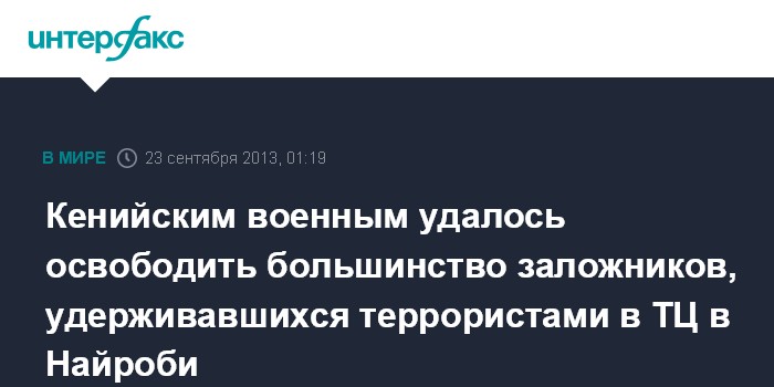 Найроби. 23 сентября. ИНТЕРФАКС - Большинство заложников из торгового центра Westgate в Найроби, захваченного террористами из сомалийской группировки "Аль-Шабаб", освобождено, сообщают Силы обороны страны в своем микроблоге в "Твиттере".