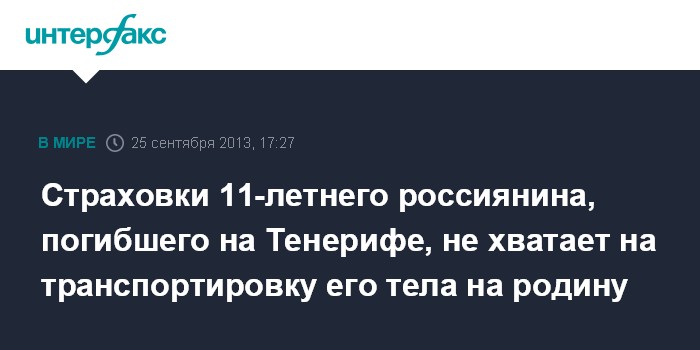 Москва. 25 сентября. INTERFAX.RU - Медицинской страховки 11-летнего Вадима Лучкина, погибшего 18 сентября на Тенерифе, не хватает на транспортировку тела в Россию, сообщил "Интерфаксу" вице-президент страховой компании "Ингосстрах" Илья Соломатин в среду.