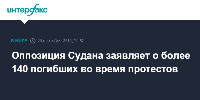 Дубай. 26 сентября. INTERFAX.RU - Суданские оппозиционеры утверждают, что за последние три дня в результате демонстраций против отмены государственных субсидий на топливо погибли не менее 141 человека, сообщает в четверг межарабский телеканал "Аль-Арабийя".