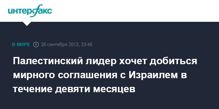 Вашингтон. 26 сентября. INTERFAX.RU - Глава Палестинской национальной администрации (ПНА) Махмуд Аббас намерен продолжить недавно возобновленные переговоры с Израилем, чтобы добиться мирного соглашения через девять месяцев, передает в четверг агентство AP.