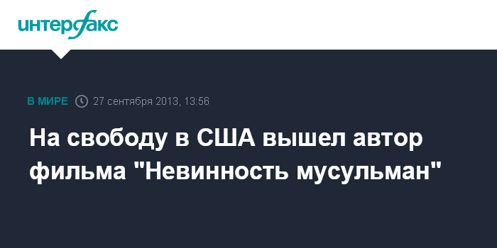 Вашингтон. 27 сентября. INTERFAX.RU - Накула Басел Накула (настоящее имя Марк Бэссли Юсуф), продюсер и режиссер скандального антиисламского фильма "Невинность мусульман", освобожден из федеральной тюрьмы в штате Калифорния, передают американские СМИ.