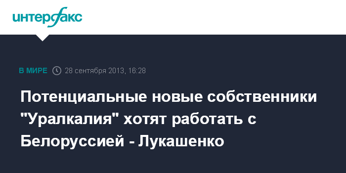 Жлобин (Гомельская область). 28 сентября. INTERFAX.RU - Президент Белоруссии Александр Лукашенко заявляет, что потенциальные новые собственники "Уралкалия" заинтересованы возобновить сотрудничество с Белоруссией. "Тот, кто хотел и хочет купить (долю в "Уралкалии" - ИФ), нам дают сигналы: "Белорусы, подождите немного, мы все равно будем с вами работать", - заявил А.Лукашенко в субботу в Жлобине.