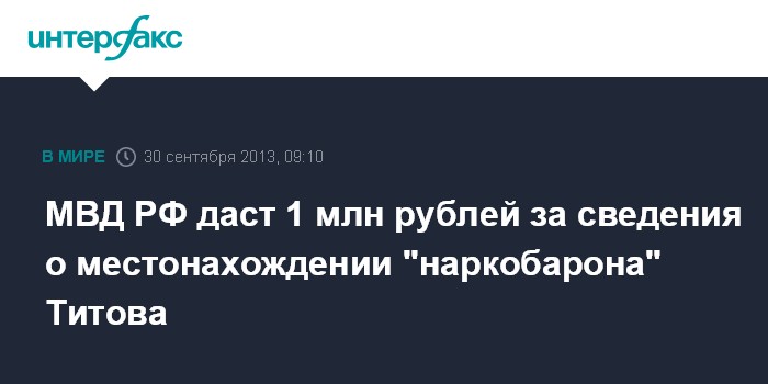 Москва. 30 сентября. INTERFAX.RU - Награда в один миллион рублей назначена МВД РФ за информацию о местонахождении Олега Титова, подозреваемого в поставках сотен килограммов кокаина в Европу, сообщили "Интерфаксу" в пресс-центре ведомства.