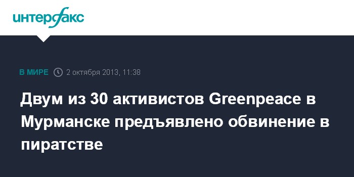 Москва. 2 октября. INTERFAX.RU - Первым двум членам команды судна Greenpeace Arctic Sunrice в среду в Мурманске предъявлены обвинения в пиратстве.