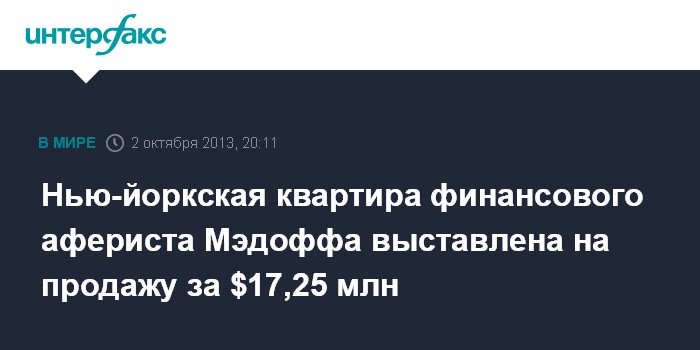 Лос-Анджелес. 2 октября. INTERFAX.RU - Нью-йоркская квартира создателя крупнейшей финансовой пирамиды Бернарда Мэдоффа выставлена на продажу за $17,25 млн, передает CNBC.