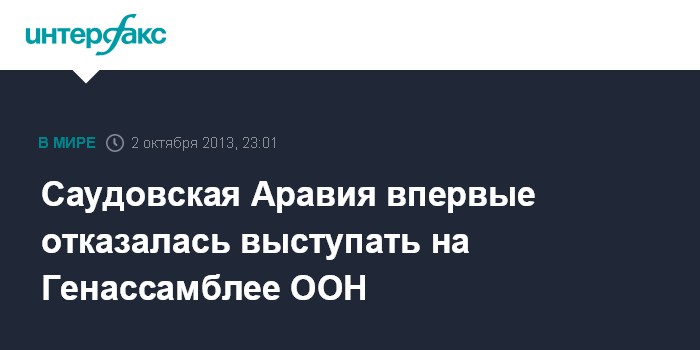 Дубай. 2 октября. INTERFAX.RU - Представитель Саудовской Аравии впервые принял решение отменить свое выступление на Генассамблее ООН в связи с неспособностью ООН решить проблемы в исламском мире и в арабских странах, сообщает в среду межарабский телеканал Al Arabiya.