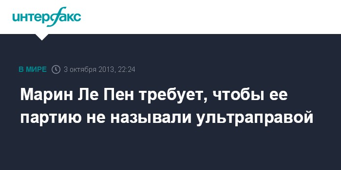 Париж. 4 октября. INTERFAX.RU - Лидер французской партии "Национальный фронт" Марин Ле Пен будет добиваться через суд, чтобы ее партию перестали называть ультраправой, сообщают в четверг местные СМИ.