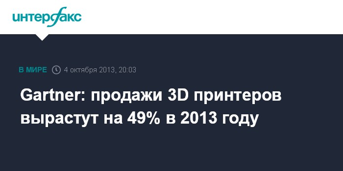 Стэмфорд. 4 октября. INTERFAX.RU - Мировые продажи принтеров, способных производить трехмерные объекты, в 2013 году увеличатся на 49%, прогнозирует исследовательская компания Gartner Inc.