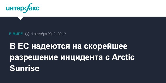 Москва.4 октября. INTERFAX.RU - В ЕС рассчитывают на урегулирование в ближайшем времени инцидента с задержанием экипажа Greenpeace с ледокола Arctic Sunrise, в который входили граждане и поданные стран Евросоюза.