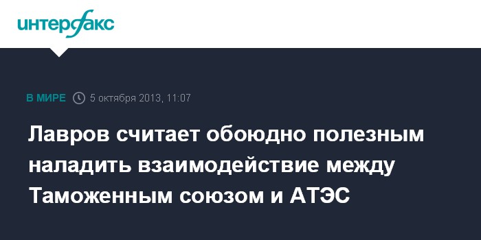 "Выстраивать зоны свободной торговли, игнорирующие интересы других стран, тем более соседей по региону, - занятие контрпродуктивное. Именно такому подходу привержены в Таможенном союзе России, Белоруссии и Казахстана", - говорится в статье главы МИД РФ Сергея Лаврова, написанной к саммиту АТЭС на Бали. "По нашему мнению, налаживание взаимодействия между Таможенным союзом и АТЭС отвечало бы общим интересам", - отметил С.Лавров.