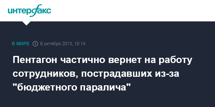Вашингтон. 6 октября. INTERFAX.RU - Большая часть сотрудников Пентагона, отправленных в вынужденный неоплачиваемый отпуск, вновь выйдет на работу на следующей неделе, сообщил министр обороны США Чак Хейгел. "Я полагаю, мы будем в состоянии сократить количество людей, которые оказались без зарплат, но всех восстановить (на работе - ИФ) мы не сможем", - говорится в коммюнике, выпущенном от эго имени.