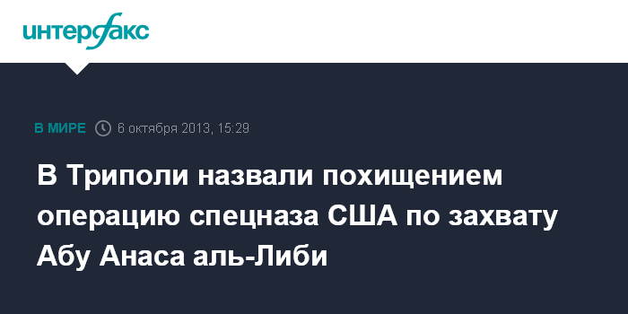 Дубай. 6 октября. INTERFAX.RU - Власти Ливии в воскресенье потребовали от Вашингтона объяснений в связи с захватом Абу Анаса аль-Либи, которого в ходе спецоперации морской спецназ США поймал неподалеку от Триполи. В Триполи эту операцию назвали похищением.