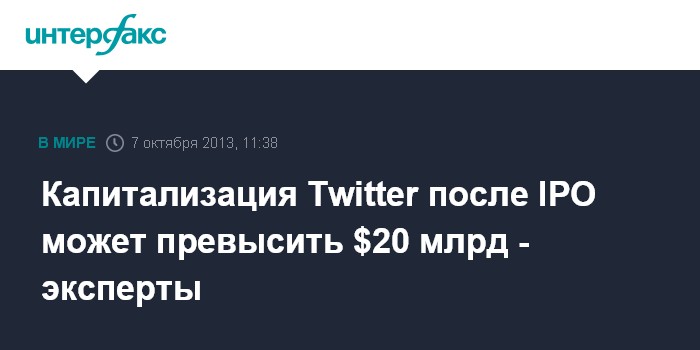 Нью-Йорк. 7 октября. INTERFAX.RU - Капитализация Twitter Inc., владельца одноименной сети микроблогов, может подняться выше $20 млрд после IPO, полагают эксперты.