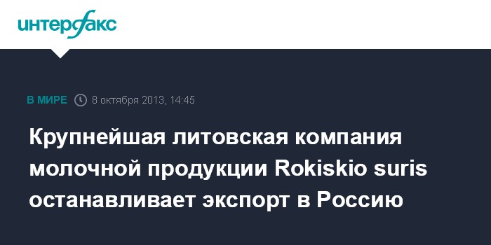 Вильнюс. 8 октября. INTERFAX.RU - Экспорт продукции одной из крупнейших литовских молокоперерабатывающих компаний Rokiskio suris в Россию остановлен. Эту информацию порталу vz.lt подтвердил руководитель Rokiskio suris Далюс Трумпа.