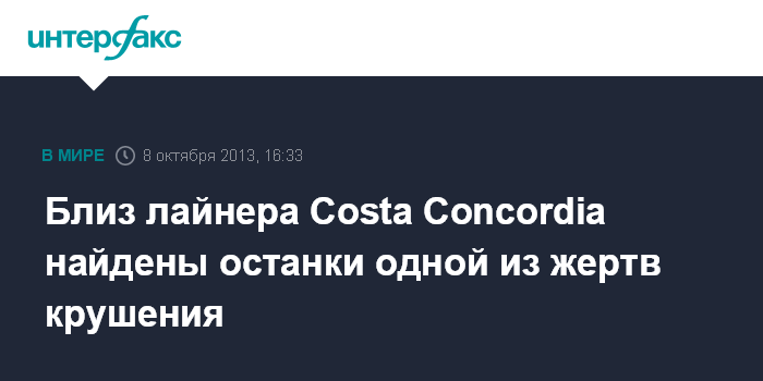 Рим. 8 октября. INTERFAX.RU - Итальянские спасатели обнаружили тело одного из двух погибших, которые до сих пор считались пропавшими без вести после крушения круизного лайнера Costa Concordia.