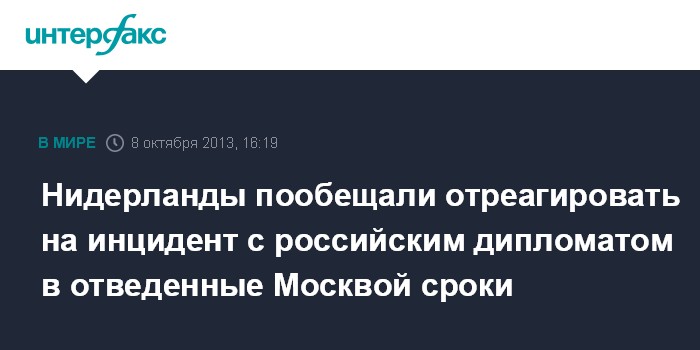 Брюссель. 8 октября. INTERFAX.RU - Министерство иностранных дел Нидерландов во вторник обязательно отреагирует на инцидент с российским дипломатом Дмитрием Бородиным, сообщает нидерландское телевидение.