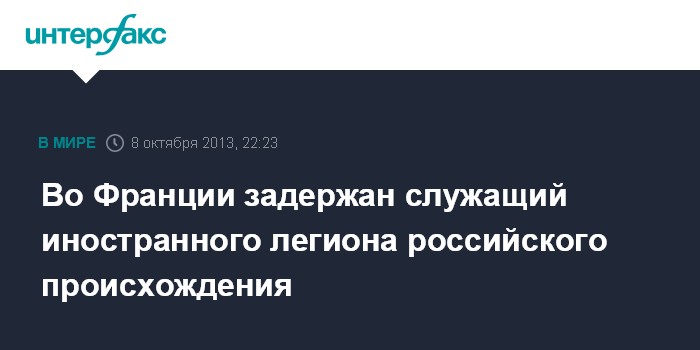 Париж. 8 октября. INTERFAX.RU - Служащий французского иностранного легиона российского происхождения задержан по подозрению в контрабанде оружия во вторник во французском городе Тулоне, сообщает интернет-сайт французского издания Midi Libre.