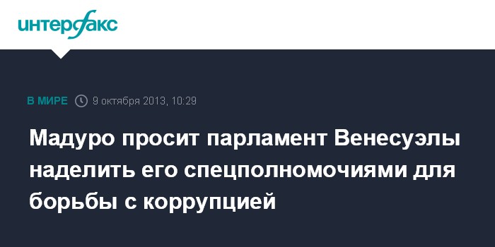 Вашингтон. 9 октября. INTERFAX.RU - Президент Венесуэлы Николас Мадуро попросил парламент страны одобрить законопроект, наделяющий его специальными полномочиями для борьбы с коррупцией, сообщает американское издание Global Post.