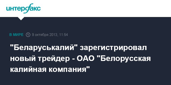Минск. 9 октября. INTERFAX.RU - В Белоруссии официально зарегистрирован новый трейдер "Беларуськалия" - ОАО "Белорусская калийная компания".