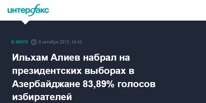 Баку. 9 октября. INTERFAX.RU - Действующий глава азербайджанского государства Ильхам Алиев набрал по результатам exit-poll, проведенного неправительственной организацией "Альянс", 83,89% голосов избирателей на президентских выборах 9 октября.