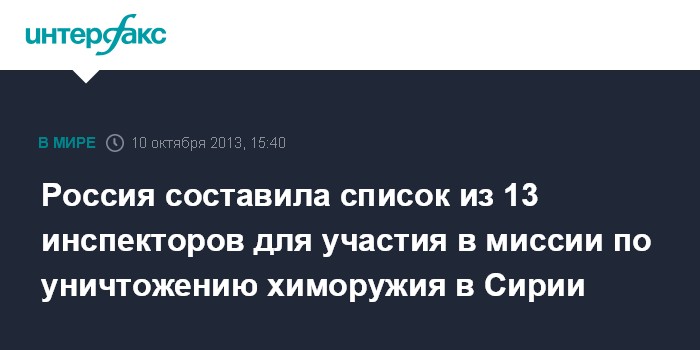 Москва. 10 октября. INTERFAX.RU - Россия направила гендиректору Организации по запрещению химического оружия (ОЗХО) список из российских экспертов для участия в будущей совместной миссии ООН и ОЗХО по инспектированию и ликвидации сирийских химических объектов.
