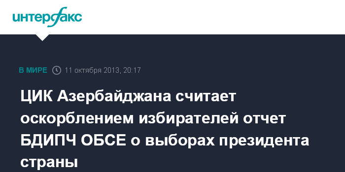 Баку. 11 октября. INTERFAX.RU - Центризбирком Азербайджана считает первичный отчет Бюро по демократическим институтам и правам человека (БДИПЧ) ОБСЕ по президентским выборам в Азербайджане оскорблением воли азербайджанских избирателей, говорится в заявлении ЦИК, распространенном в пятницу.