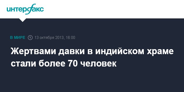 Дели. 13 октября. INTERFAX.RU - В результате давки, образовавшейся на мосту близ индуистского храма в штате Мадхья-Прадеш в центральной части Индии, погибли более 70 человек, сообщает в воскресенье газета The Times of India. По сведениям издания, около 50 человек погибли в самой давке, остальные утонули, спрыгнув в панике с моста в воду. Более 100 человек пострадали.