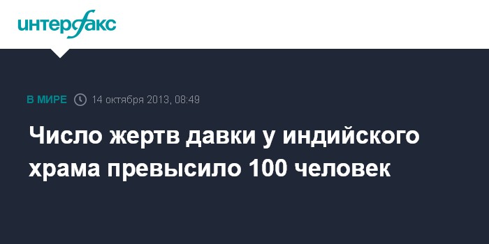 Дели. 14 октября. INTERFAX.RU - В результате давки, образовавшейся на мосту близ индуистского храма в штате Мадхья-Прадеш в центральной части Индии, погибли 109 человек, сообщают в понедельник сотрудники местной полиции. Ранее сообщалось о 91 погибшем.