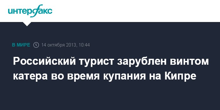 Москва. 14 октября. INTERFAX.RU - Турист из России погиб, попав под винты катера во время купания на кипрском курорте, сообщает портал InCiprus.com.