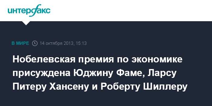 Стокгольм. 14 октября. INTERFAX.RU - Лауреатами премии по экономике памяти Альфреда Нобеля за 2013 г. стали американские ученые Юджин Фама, Ларс Питер Хансен и Роберт Шиллер, объявили в понедельник в шведской Королевской академии наук.