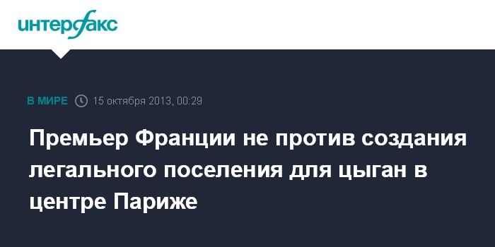 Париж. 15 октября. INTERFAX.RU - Французский премьер-министр Жан-Марк Эро заявил, что не возражает против инициативы о создании в 16-м округе Парижа специального поселения для цыган, сообщает газета Le Figaro.
