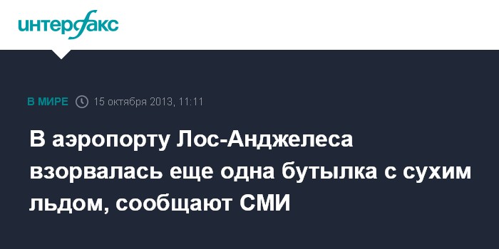 Вашингтон. 15 октября. INTERFAX.RU - В аэропорту Лос-Анджелеса (штат Калифорния, США) взорвалась еще одна бутылка с сухим льдом, сообщает во вторник AP.