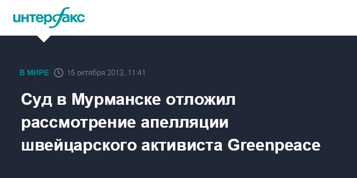 Мурманск. 15 октября. INTERFAX.RU - Октябрьский районный суд Мурманска отложил рассмотрение апелляции на арест швейцарского активиста Greenpeace Марко Паоло, передал корреспондент "Интерфакса".