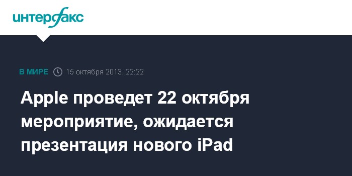 Купертино. 16 октября. INTERFAX.RU - Американская Apple Inc. разослала приглашения на мероприятие, которое пройдет 22 октября в Сан-Франциско, сообщает MarketWatch. Компания не уточняет детали мероприятия, однако все ожидают, что на нем будут представлены новые версии планшетников iPad и iPad mini.