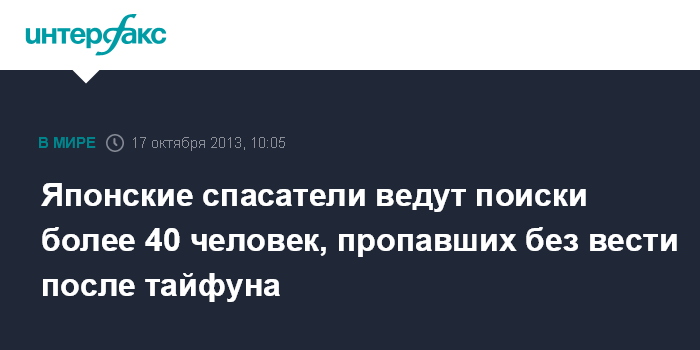 Токио. 17 октября. INTERFAX.RU - В Японии спасательные бригады продолжают поиски 43 человек, в том числе 39 на острове Идзуосима, считающихся пропавшими без вести после удара тайфуна "Випа" в минувшую среду, сообщает японский телеканал NHK.
