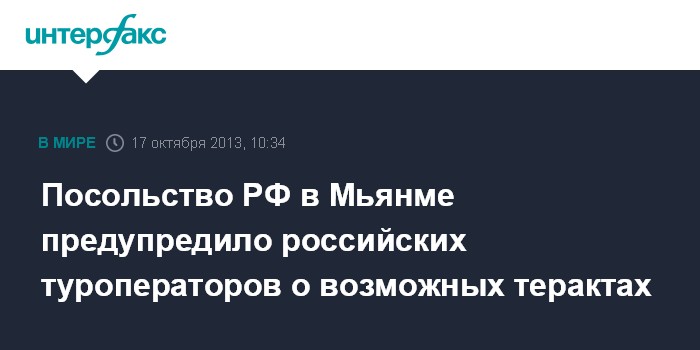 Москва. 17 октября. INTERFAX.RU - Сотрудники посольства России в Мьянме разослали российским туроператорам по Юго-Восточной Азии письмо с просьбой предупредить и обезопасить всех туристов, которые собираются в путешествие по Бирме (Мьянме), сообщает Ассоциация туроператоров России (АТОР) в четверг.