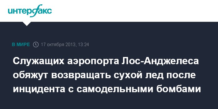 Лондон. 17 октября. INTERFAX.RU - Руководство аэропорта Лос-Анджелеса внесло изменения в процедуру разгрузки и выброса сухого льда с борта самолета, чтобы избежать в дальнейшем инцидентов с его использованием, сообщает в четверг британское издание The Guardian.