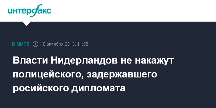 Брюссель. 18 октября. INTERFAX.RU - Сотрудник нидерландской полиции, задержавший российского дипломата Дмитрия Бородина, наказан не будет, сообщил глава правительства Нидерландов Марк Рютте в интервью, опубликованном в пятницу в нидерландской газете Telegraaf.