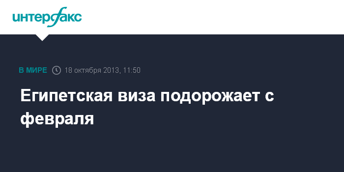 Москва. 18 октября. INTERFAX.RU - Увеличение визового сбора в Египет произойдет не в ноябре 2013 г., как планировалось, а в феврале 2014 г., сообщила "Интерфаксу" генеральный директор туроператора Pegas Touristik Анна Подгорная.