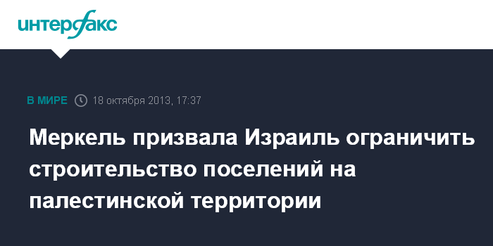 Берлин. 18 октября. INTERFAX.RU - Канцлер Германии Ангела Меркель обратилась к израильским властям с призывом быть более сдержанными при строительстве поселений на палестинской территории.
