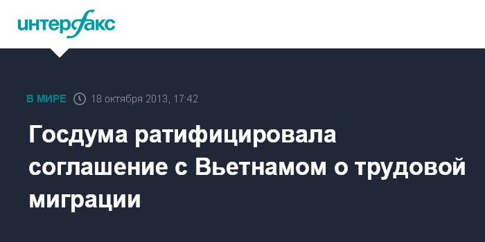 Москва. 18 октября. INTERFAX.RU - Госдума ратифицировала соглашение между Россией и Вьетнамом о временной трудовой деятельности граждан на территории двух стран.