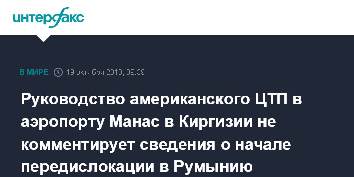 Бишкек. 19 октября. INTERFAX.RU - Руководство американского Центра транзитных перевозок (ЦТП) пока не комментирует информацию о возможном выводе Центра с территории Киргизии в Румынию.