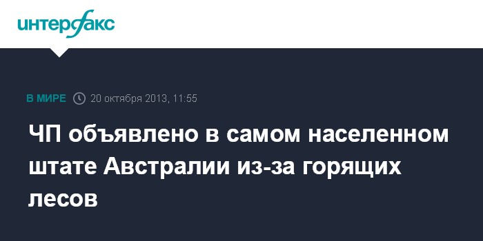 Пекин. 20 октября. INTERFAX.RU - Режим чрезвычайного положения введен в австралийском штате Новый Южный Уэльс, где находится Сидней, в связи с лесными пожарами, сообщает в воскресенье британская телерадиокорпорация BBC.