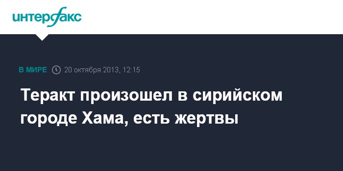 Дубай. 20 октября. INTERFAX.RU - Начиненный взрывчаткой автомобиль взорвался в сирийском городе Хама, сообщает в воскресенье ливанская газета The Daily Star. По данным издания, теракт произошел на окраине города, в результате взрыва есть погибшие и раненые.