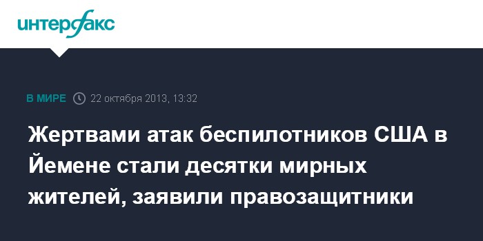 Вашингтон. 22 октября. INTERFAX.RU - Жертвами атак американских беспилотников в Йемене за последние годы стали десятки мирных жителей, говорится в опубликованном во вторник докладе правозащитной организации Human Rights Watch.