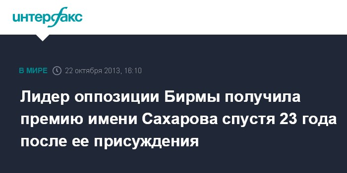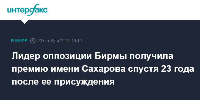 Париж. 22 октября. INTERFAX.RU - В Страсбурге во вторник вручили премию имени Андрея Сахарова "За свободу мысли" лауреату Нобелевской премии мира, лидеру бирманской оппозиции Сан Су Чжи, сообщает агентство EFE.