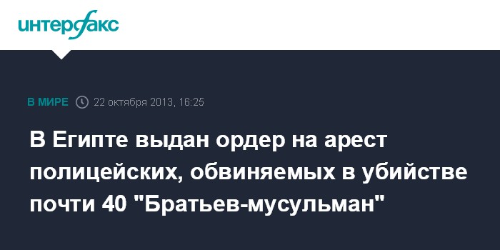 Каир. 22 октября. INTERFAX.RU - Египетская прокуратура постановила арестовать четырех офицеров полиции, которые обвиняются в убийстве 38 членов движения "Братья-мусульмане", сообщает ливанская газета Daily Star.